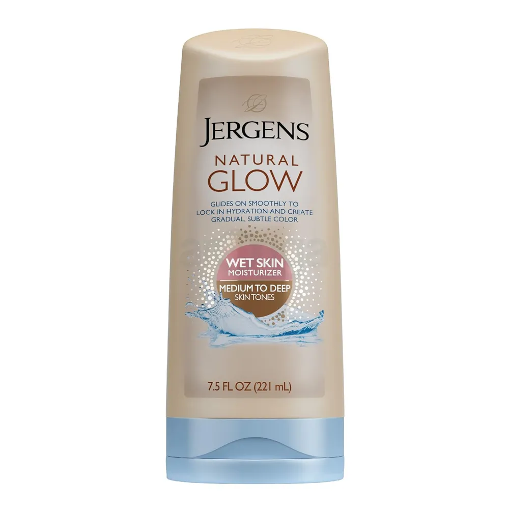 - GRADUAL SUNLESS TANNING – Jergens Natural Glow Wet Skin Body Lotion glides on smooth for in-shower application, and develops color with minimal transfer or drying time.