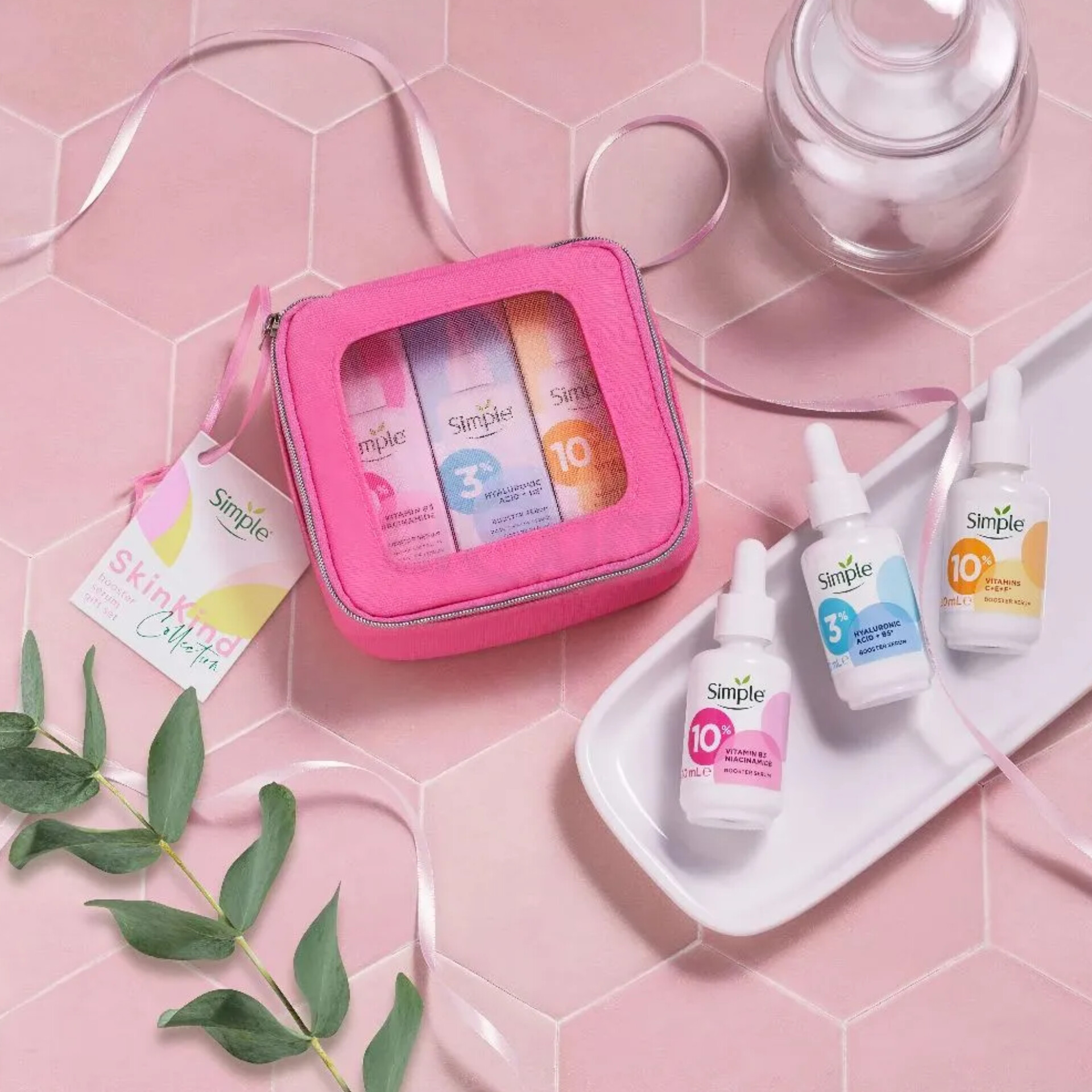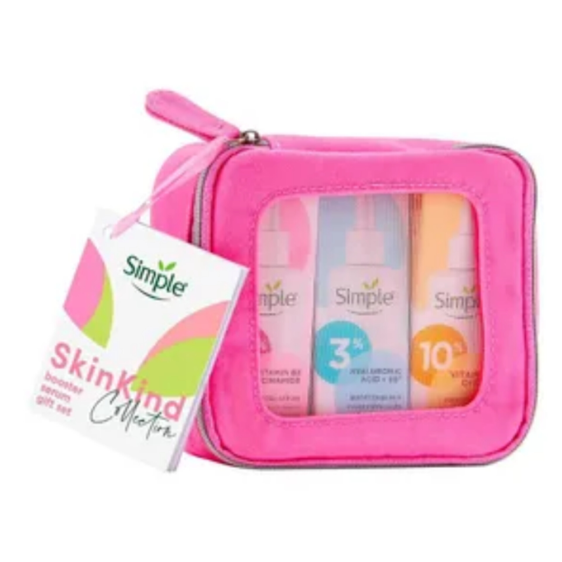 - Simple Skin Kind Booster Serum Gift Set features three skin-friendly gifts for her from our Skin Kind range, presented in a small travel beauty bag